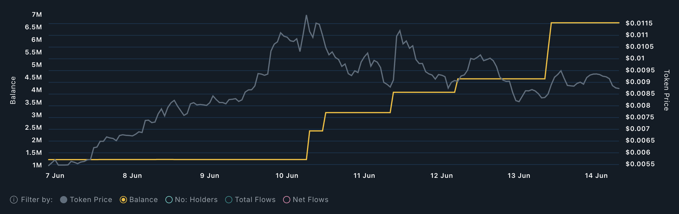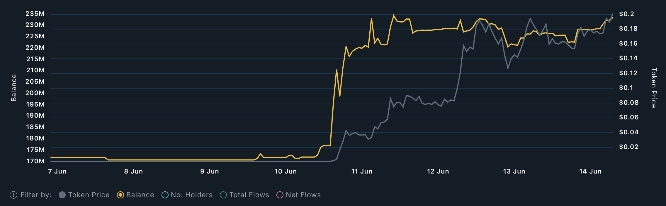 クジラの行動はAURAの現在の強さをさらに支持している。6月10日以来、大型ウォレットが保有するAURAの量は1億7200万から2億3300万トークンに増加しており、主要な保有者からの継続的な関心を反映している。