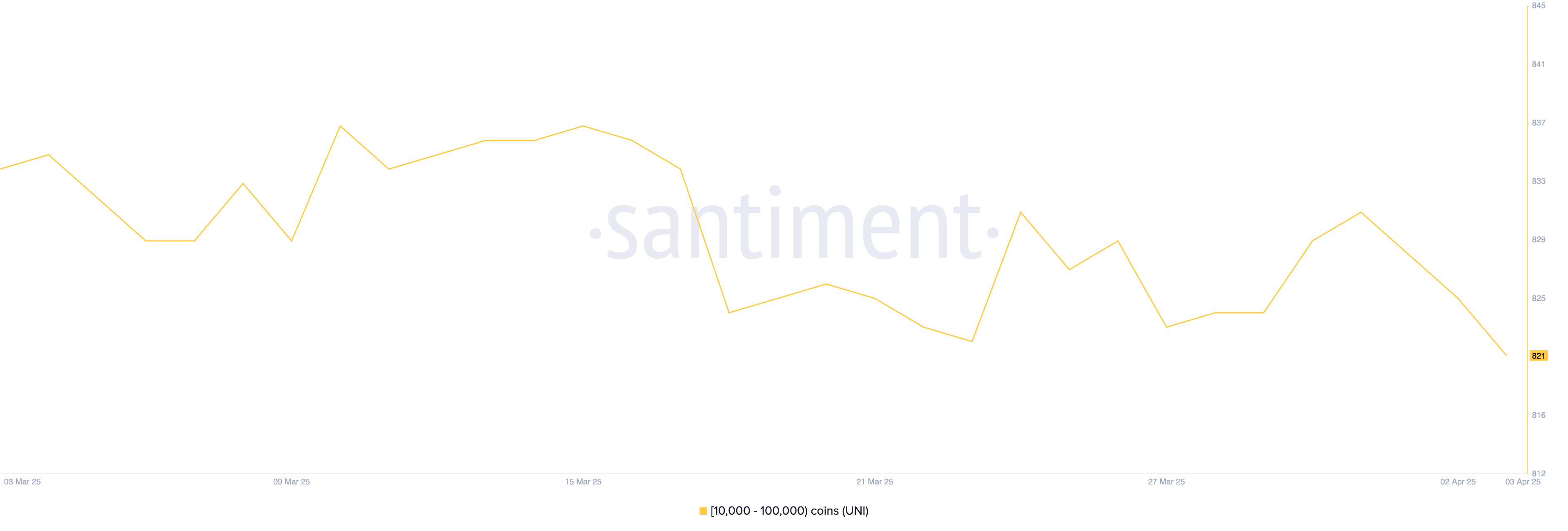 ユニスワップ(UNI)の1万から10万トークンを保有するアドレスの数は、トランプのいわゆる「解放の日」以前から減少し続けており、その後も続いている。