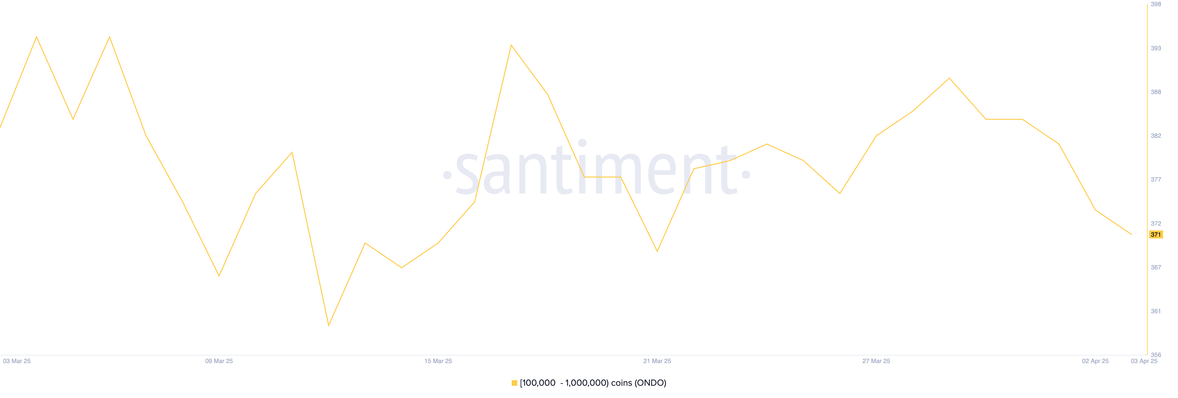 ONDOはチェーンリンクと似たトレンドを示しており、3月26日から3月29日にかけて、1万から10万ONDOを保有するアドレスの数が376から390に増加した。