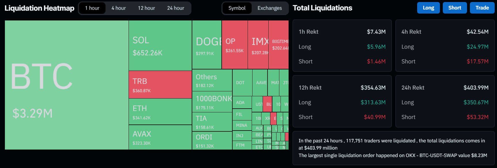 さらに、Coinglassの報告によると、過去24時間の清算総額は4億ドル強で、11万7770人のトレーダーが清算された。