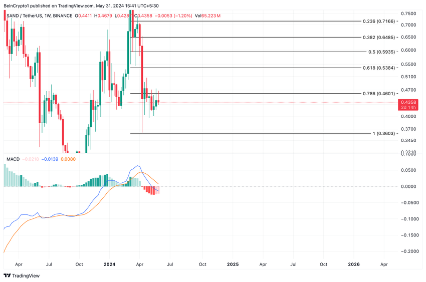 アルトコインの最後はサンドボックス(SAND)だ。SANDの移動平均収束/発散(MACD)インジケータの現在のセットは、短期平均が長期平均を下回っていることを示している。これは弱気シグナルで、市場参加者はショートを取り、ロングポジションから撤退する合図と解釈している。
