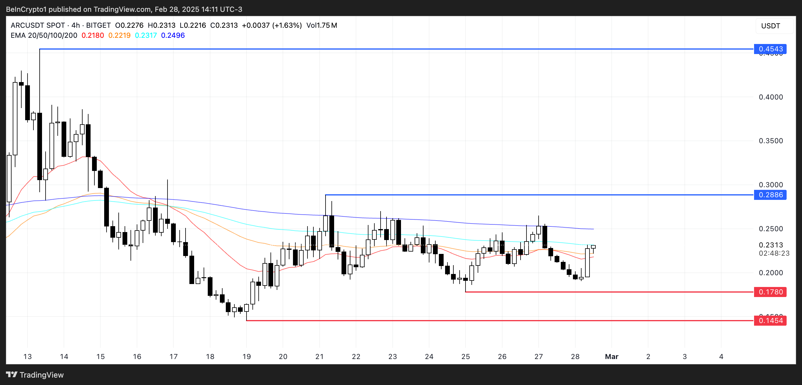 しかし、現在の調整が続く場合、ARCは0.178ドルのサポートをテストする可能性があり、そのレベルが失敗すれば0.14ドルまでさらに下落する可能性がある。