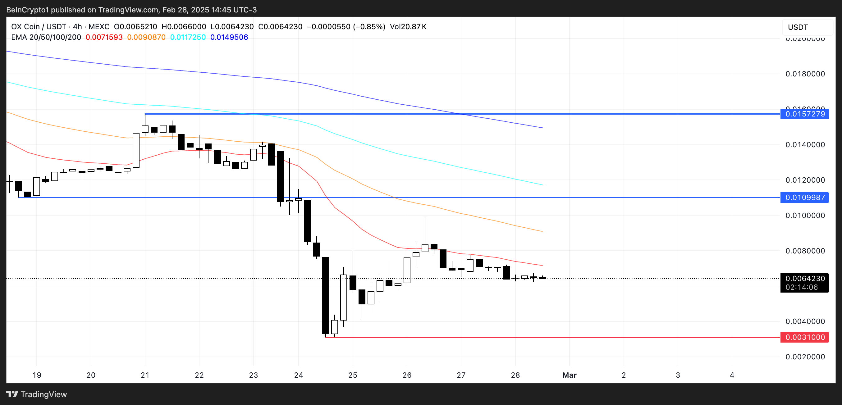 OXが最近の調整から回復できれば、0.01ドルの抵抗を試し、0.015ドルまで上昇する可能性がある。逆に、調整が続く場合、OXは0.0031ドルまで下落する可能性がある。