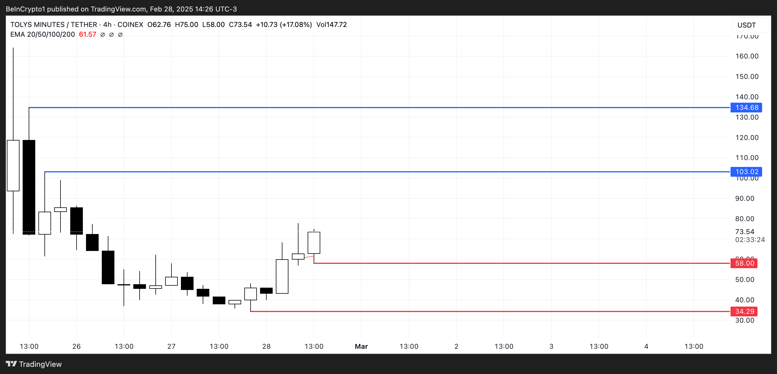 ブームが続く場合、TOLYは103ドルの抵抗をテストする可能性があり、そのレベルを突破すれば134ドルへのラリーを引き起こす可能性がある。逆に、勢いが衰える場合、TOLYは58ドルまで下落し、そのサポートが失われれば34ドルまでさらに下落する可能性がある。
