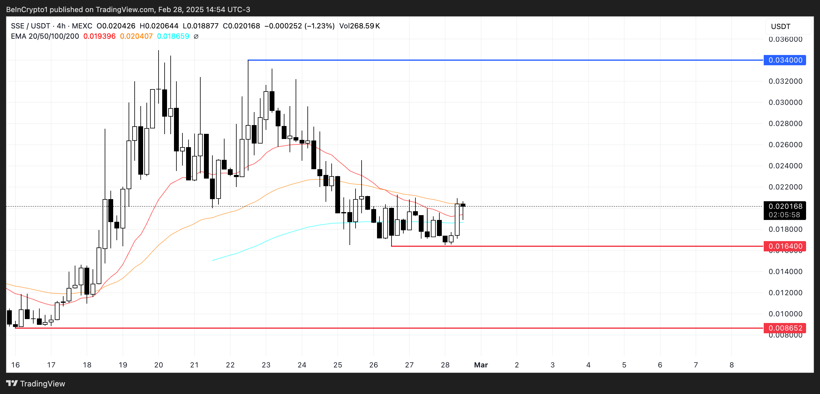 逆に、価格が下落した場合、SSEは0.016ドルのサポートを試す可能性がある。そのレベルを失うと、さらに0.0086ドルまで下落する可能性がある。