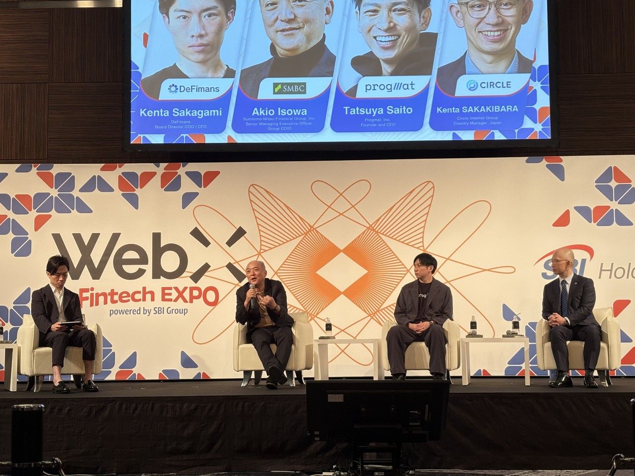 磯和氏はメガバンク、齋藤氏はブロックチェーン基盤企業、榊原氏は米大手ステーブルコイン発行企業としての立場から、モデレーターの坂上謙太(DeFimans取締役 COO/CFO)の質問に答える形で語った。