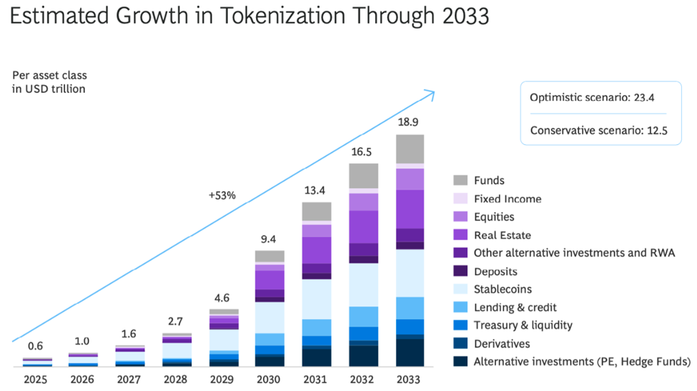 一方、ボストン・コンサルティング・グループとリップルは、トークン化されたRWA市場が2025年の6000億ドルから2033年には18兆9000億ドルに拡大する可能性があると述べている。