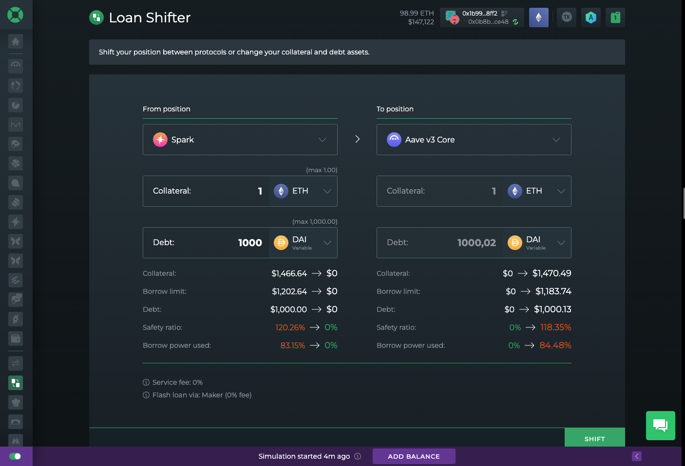 - 負債スワップ: ローン・シフターのダッシュボードでは、同じプロトコル内またはプロトコル間で債務資産のスワップを行うことができます。