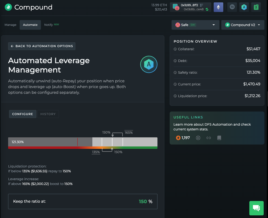 自動レバレッジ管理ダッシュボードでは、継続的に維持する目標担保比率を設定することも、比率が定義されたしきい値を超えた場合にのみ作動する、より正確な高度なトリガーを設定することもできます。