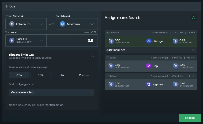 DeFi Saverでは、ユーザーはイーサリアム、Base、Arbitrum One、Optimismをまたいで、あるネットワークから別のネットワークにトークンをブリッジすることができます。ブリッジ機能は、有名なアグリゲーターであるLi.Fiを集約し、クロスチェーン転送に最適なルートを見つけます。また、ユーザーは好みのルートを選択し、スリッページを調整するオプションもあります。