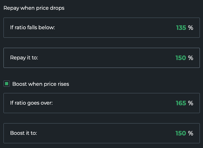 担保設定比率が一定水準を下回ると(担保の価格が下落した場合や負債が増加した場合に起こり得ます)、レバレッジを自動的に引き下げます(自動返済)。比率が定義されたしきい値を超えると、自動的にレバレッジを上げることができます(自動ブースト)。これは主に以下を防ぐために使用されます。