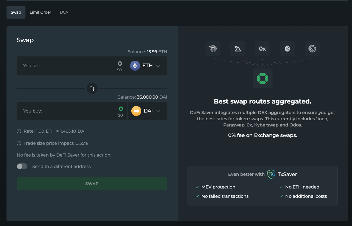 - 最適化された流動性システム:最良のレートを維持し、価格への影響を最小限に抑えるため、DeFi Saverは異なるDEXに取引を分散させることができます。