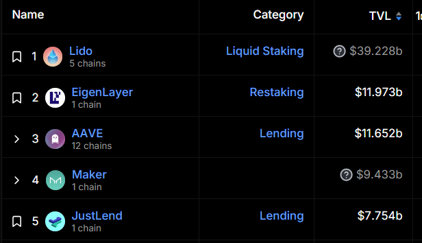 イーサリアムベースのステーキング・プロトコルであるLidoは、約390億ドルのTVLで最大のDeFiプロトコルの地位を維持しており、これは39%の市場支配力を表している。オンチェーンデータによると、このプロトコルは1000万ステーキングETHを超えようとしている。