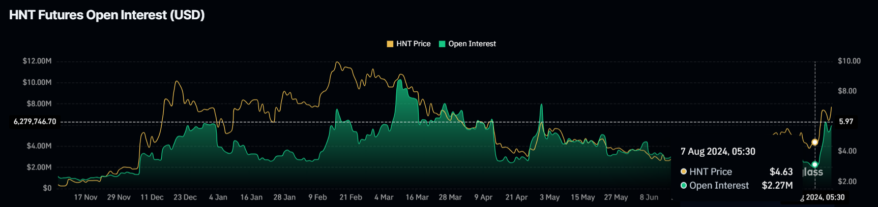 さらに、HNTの価格の上昇は、オープンインタレストの大幅な増加が示すように、投資家の関心の高まりによって維持される可能性がある。過去1週間で、オープンインタレストは226万ドルから595万ドルに急増している。