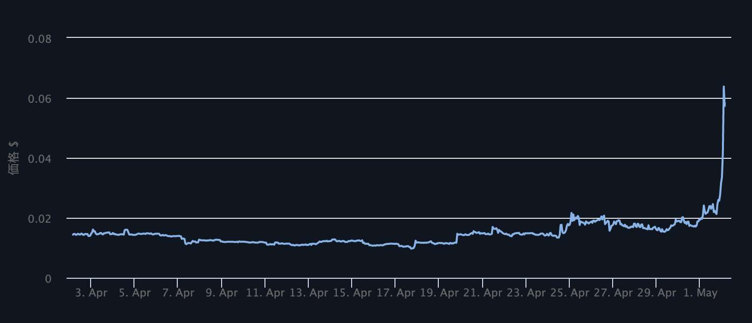 SponsoredDINOコインは2日午前3時ごろを境に0.021ドル台から急騰し、0.063ドル台を上回った。直近24時間の上昇率は190%を記録。