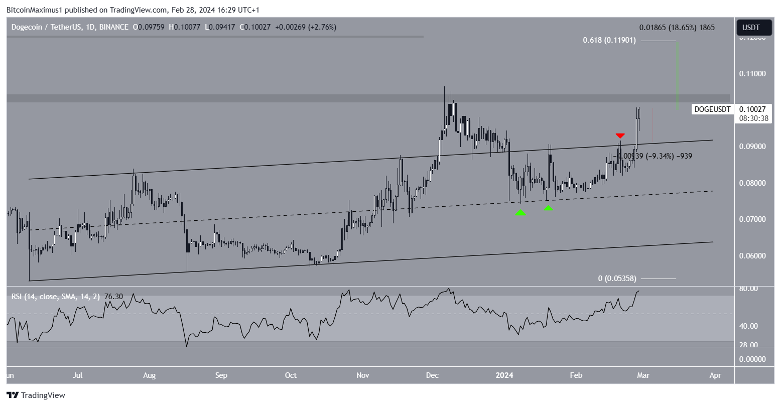 週足のテクニカル分析によると、DOGE価格は2023年11月に長期下降トレンドラインをブレイクした。この上昇により、来月0.108ドルの年初来高値を更新した。しかし、その後DOGE価格は下落した。