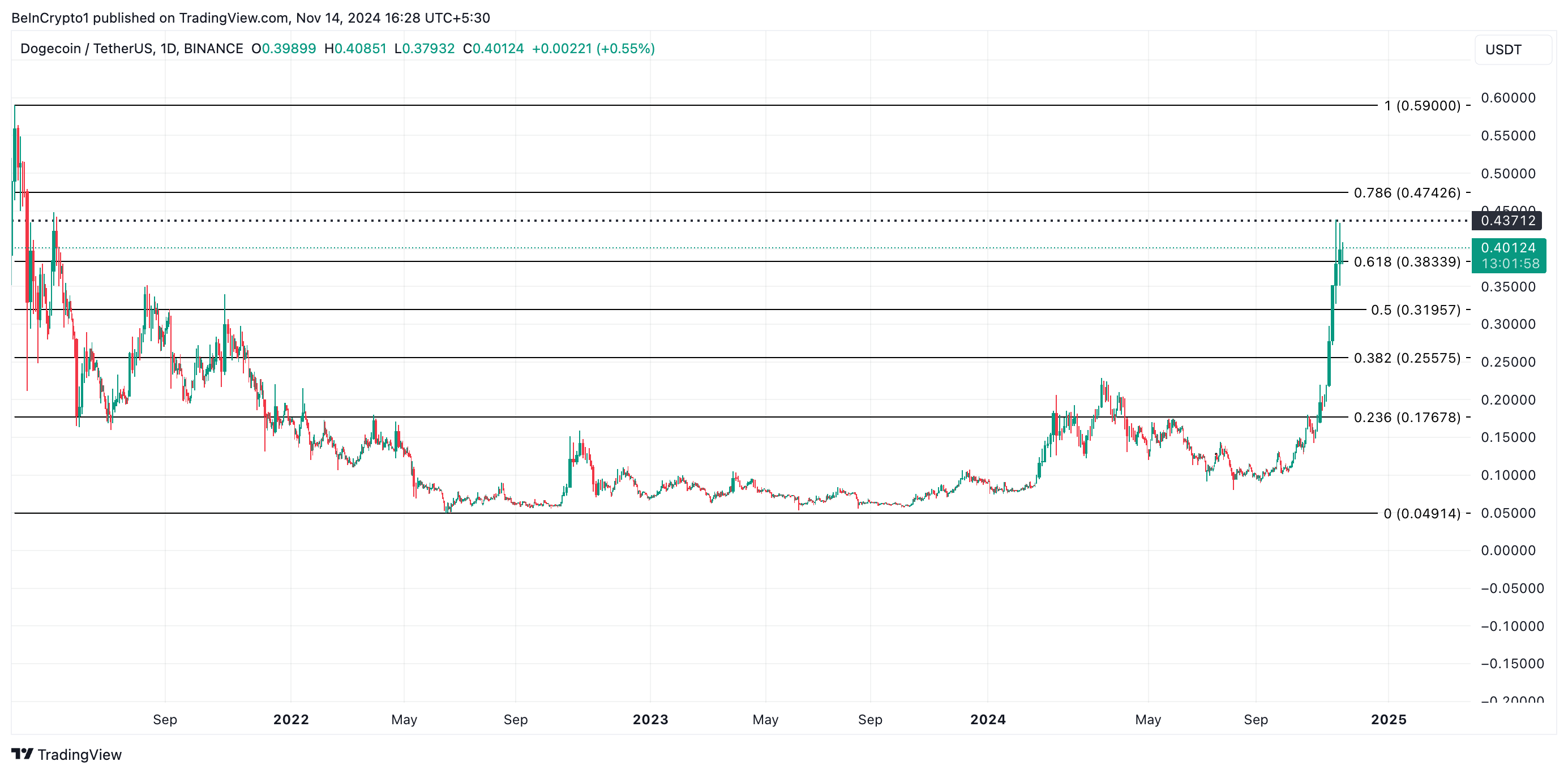 主要なミームコインであるドージコイン(DOGE)の価格は、最近急激な上昇を見せている。過去1週間で111%の上昇を記録し、現在は3年ぶりの高値0.40ドルで取引されている。
