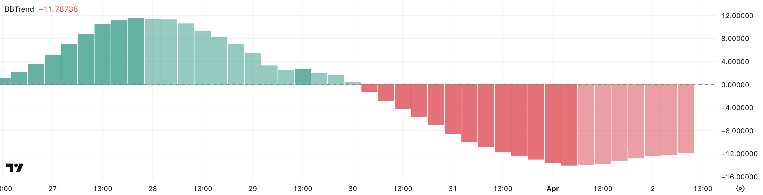 ドージコインのBBTrend指標は現在-11.78で、昨日のより極端な-13.96から改善しているが、依然として強い弱気である。