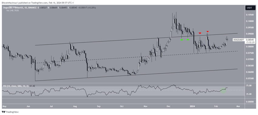 しかし、DOGEは上昇を維持できず、チャネル内で下落した。その後、レジスタンストレンドラインを2回検証した(赤のアイコン)。このような弱気な展開にもかかわらず、Dogecoin価格はパターンの中央から下降しなかった。むしろ、跳ね返され始め、再びレジスタンストレンドラインに近づいている。