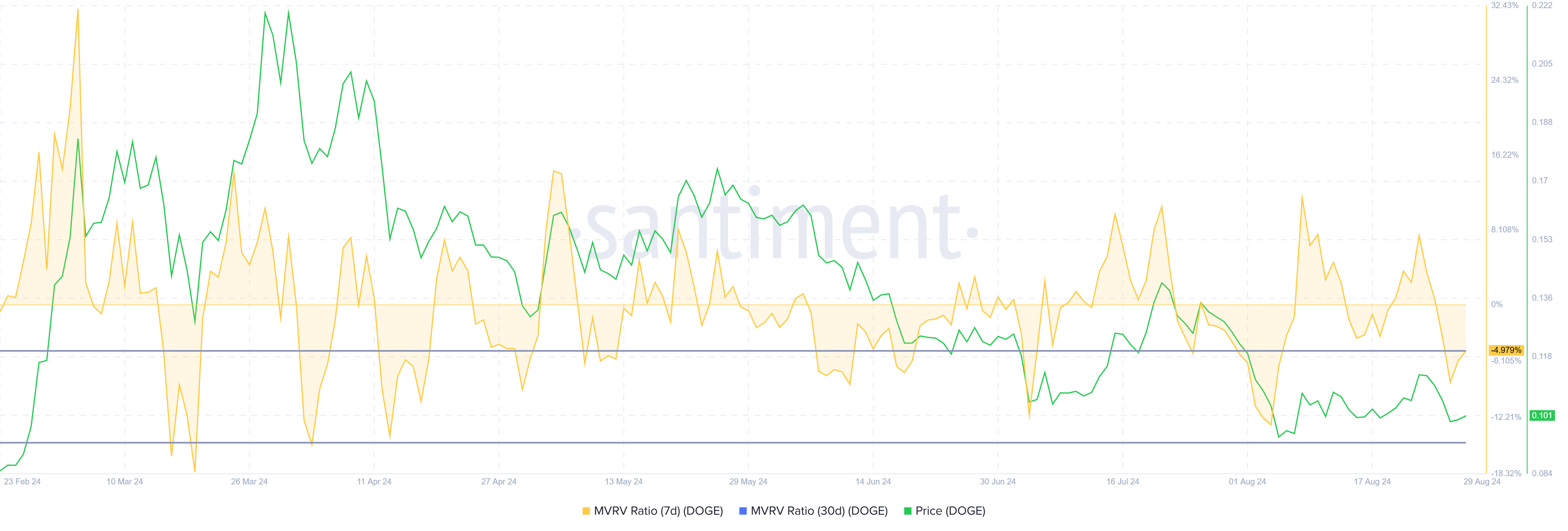 MVRV比率は、投資家の利益と損失を評価します。現在、Dogecoinの短期7日間のMVRVは4.9%であり、損失と売り圧力の終了を示しています。歴史的に、DOGE MVRVが-4.9%から-14.9%の間であれば、通常、回復ラリーの始まりを示しており、蓄積機会ゾーンとなっています。
