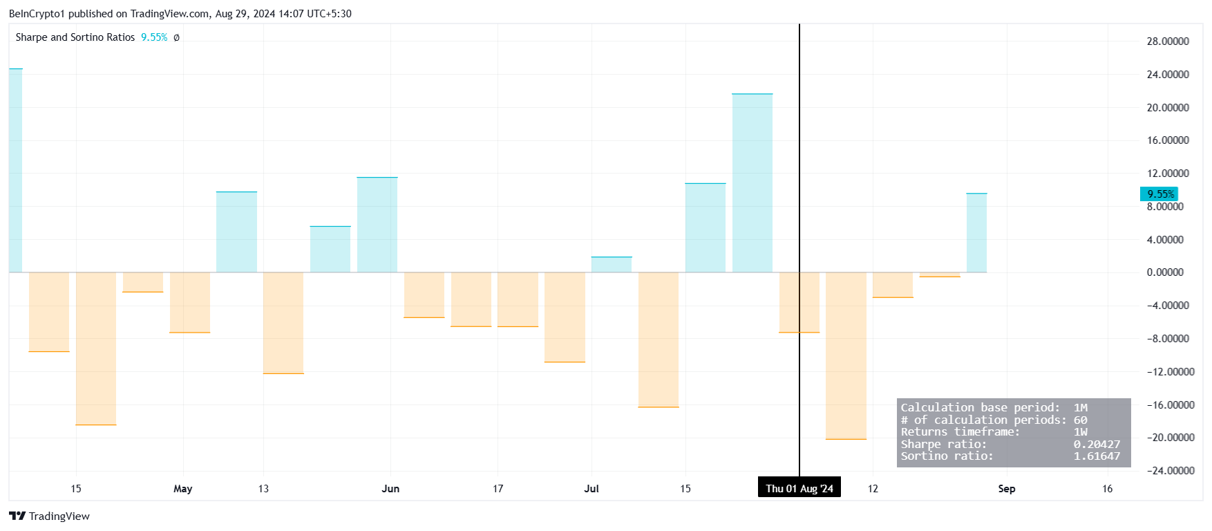 Sponsoredこれは、(リスクフリーレートに対する)超過リターンをボラティリティと比較することによって行われます。シャープレシオが高いほど、リスクとリターンのプロファイルが有利であることを示します。現在、Dogecoinのシャープレシオは週足で9.55%です。
