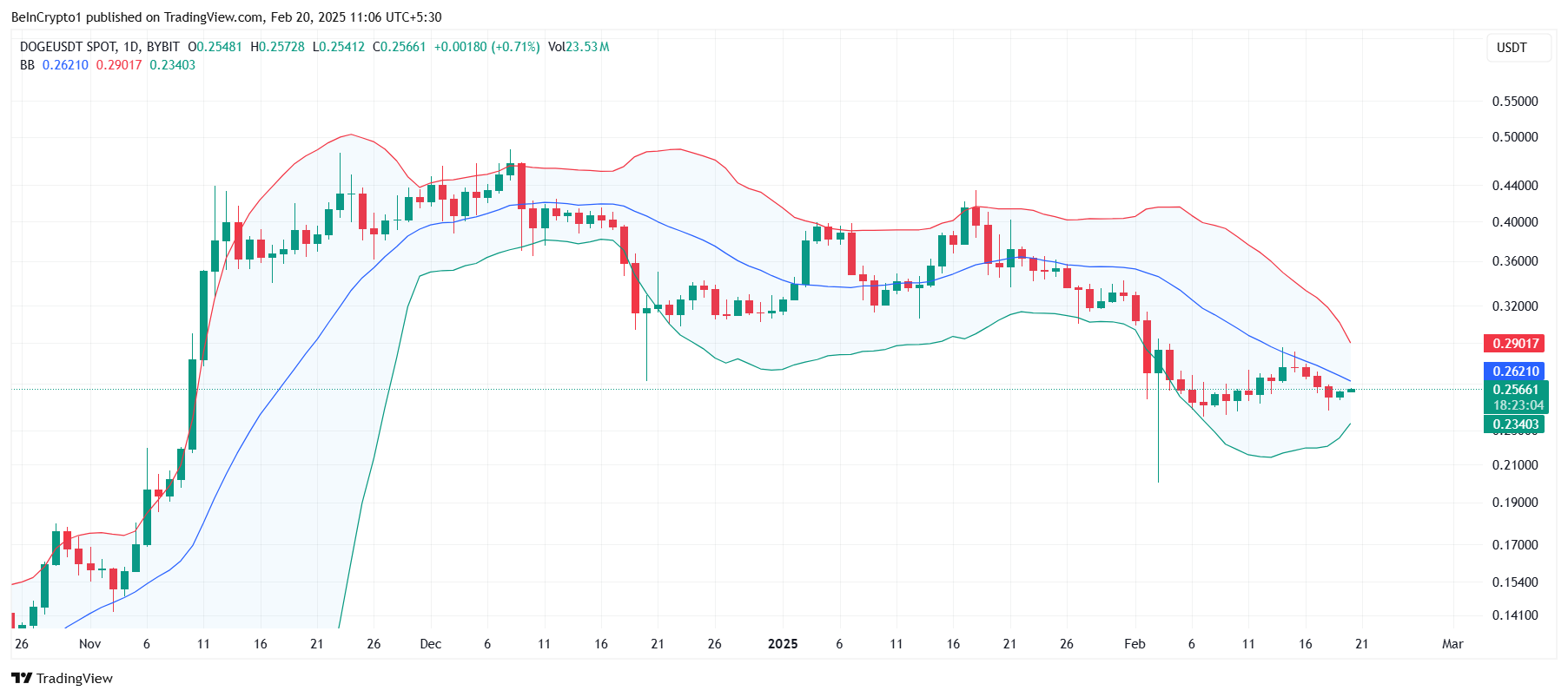 ドージコインのマクロモメンタムは、潜在的なボラティリティを示している。ボリンジャーバンドなどのテクニカル指標は収束の兆候を示しており、これはしばしば急激な価格変動の期間を示唆する。現在、ローソク足はバンドの基準線の下にあり、この収束はボラティリティがドージコインの価格をラリーに向かわせる可能性を示している。