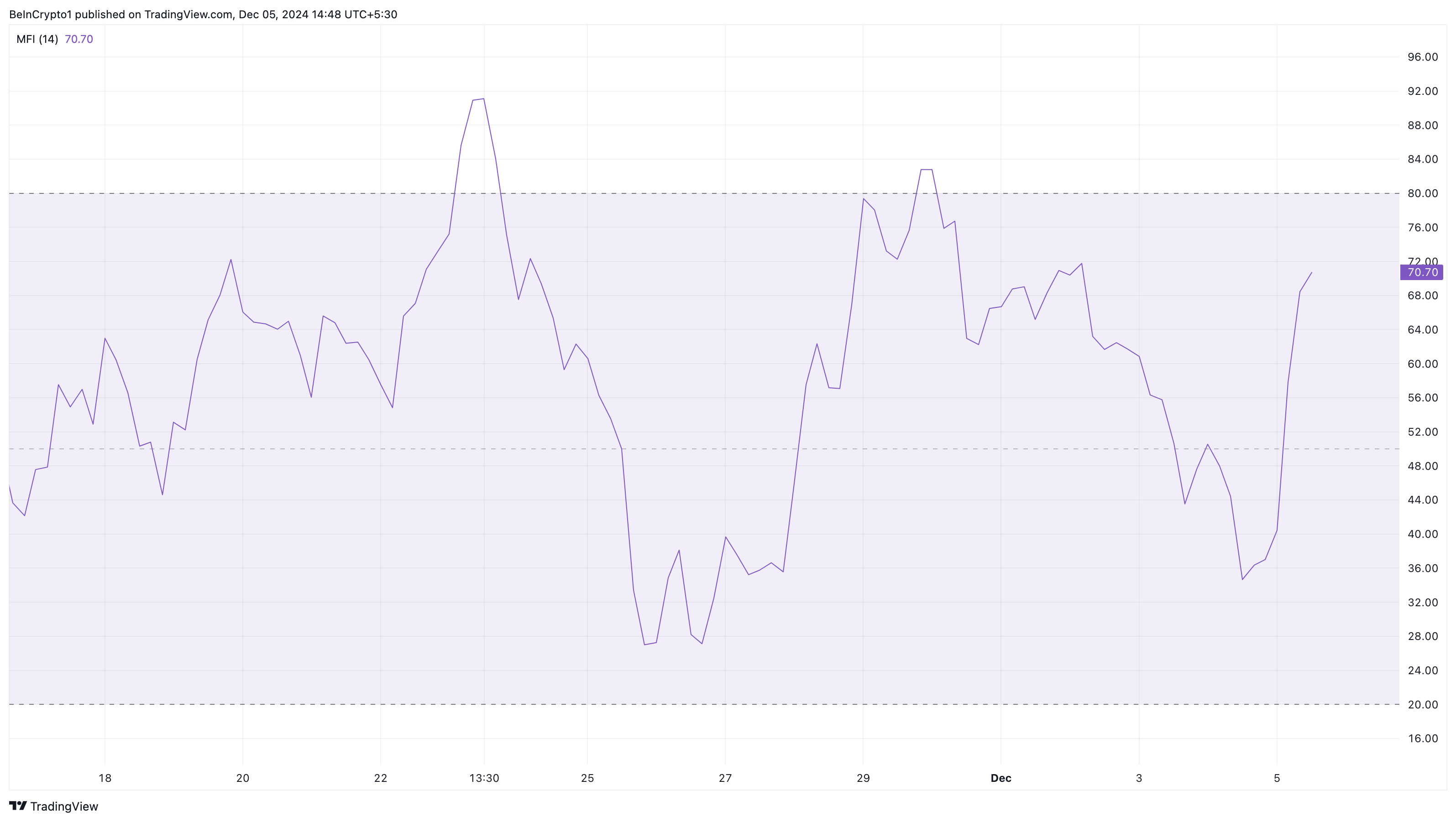 さらに、4時間のDOGE/USDチャートは上昇傾向を強化しており、マネーフローインデックス(MFI)が70.70に上昇している。MFIは暗号資産への資本流入を測定し、市場の勢いに関するインサイトを提供する。