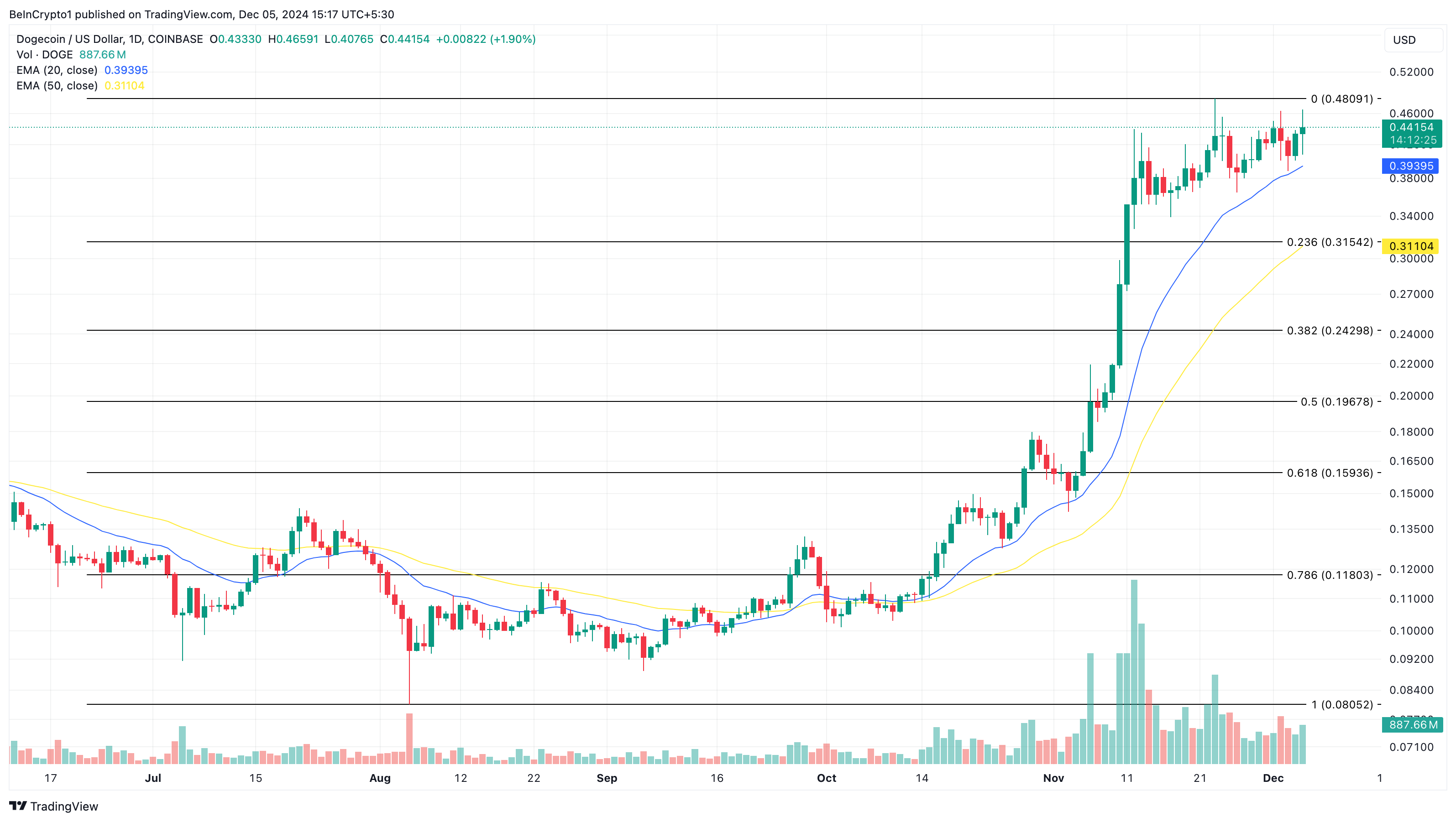 価格がEMAの上にある場合、トレンドは上昇傾向である。一方、価格がトレンドの下にある場合、トレンドは下降傾向である。したがって、ドージコインの価格は上昇を続け、短期的に0.48ドルに達する可能性がある。