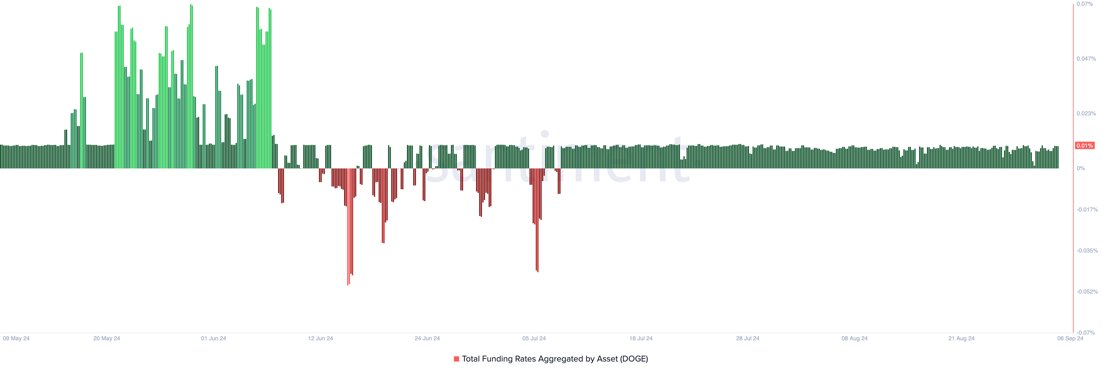 DOGEが過去6ヶ月間でその価値を半分失ったにもかかわらず、多くの先物トレーダーはひるむことなく、ロングポジションをオープンし続けています。この自信は、6月以降、ミームコインの一貫してプラスの資金調達率に反映されています。これは、永久先物契約で使用されるメカニズムで、契約価格がスポット価格に近づくようにするものです。
