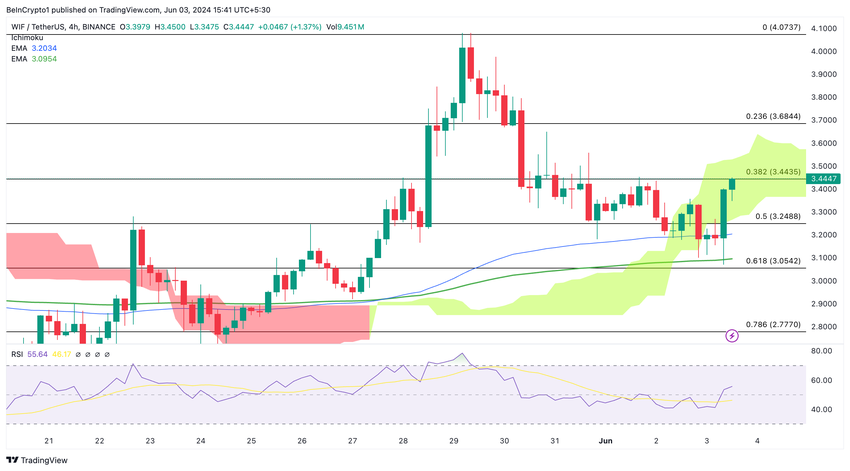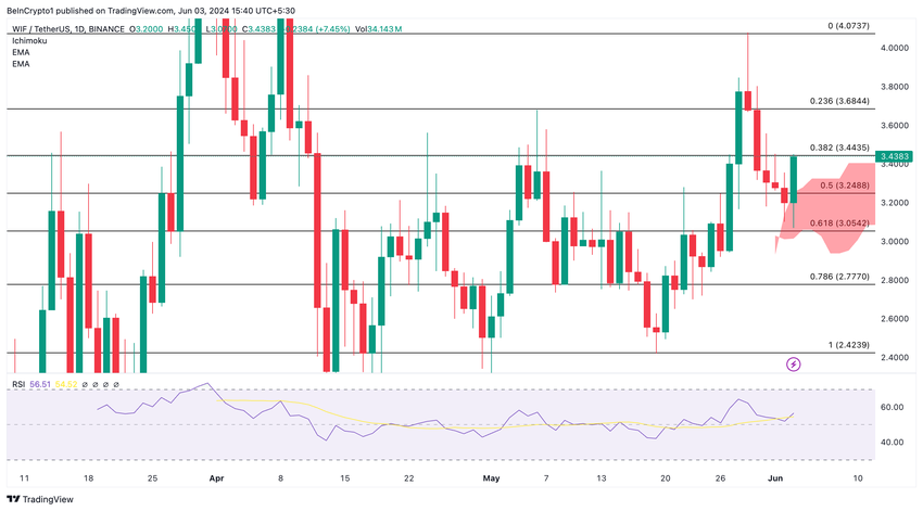現在、WIFは3.43ドルで取引されており、7.44%の大幅な上昇を示している。価格が主要フィボナッチ水準を上回ったことは、この強気な見通しをさらに裏付けている。