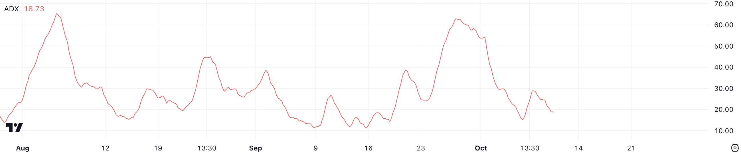 ADX(平均方向性指数)は、トレンドの強さを数値化するために使用される。ADXの範囲は0~100で、一般的に25を上回ると強いトレンド、20を下回ると弱いトレンドまたは存在しないトレンドと判断される。