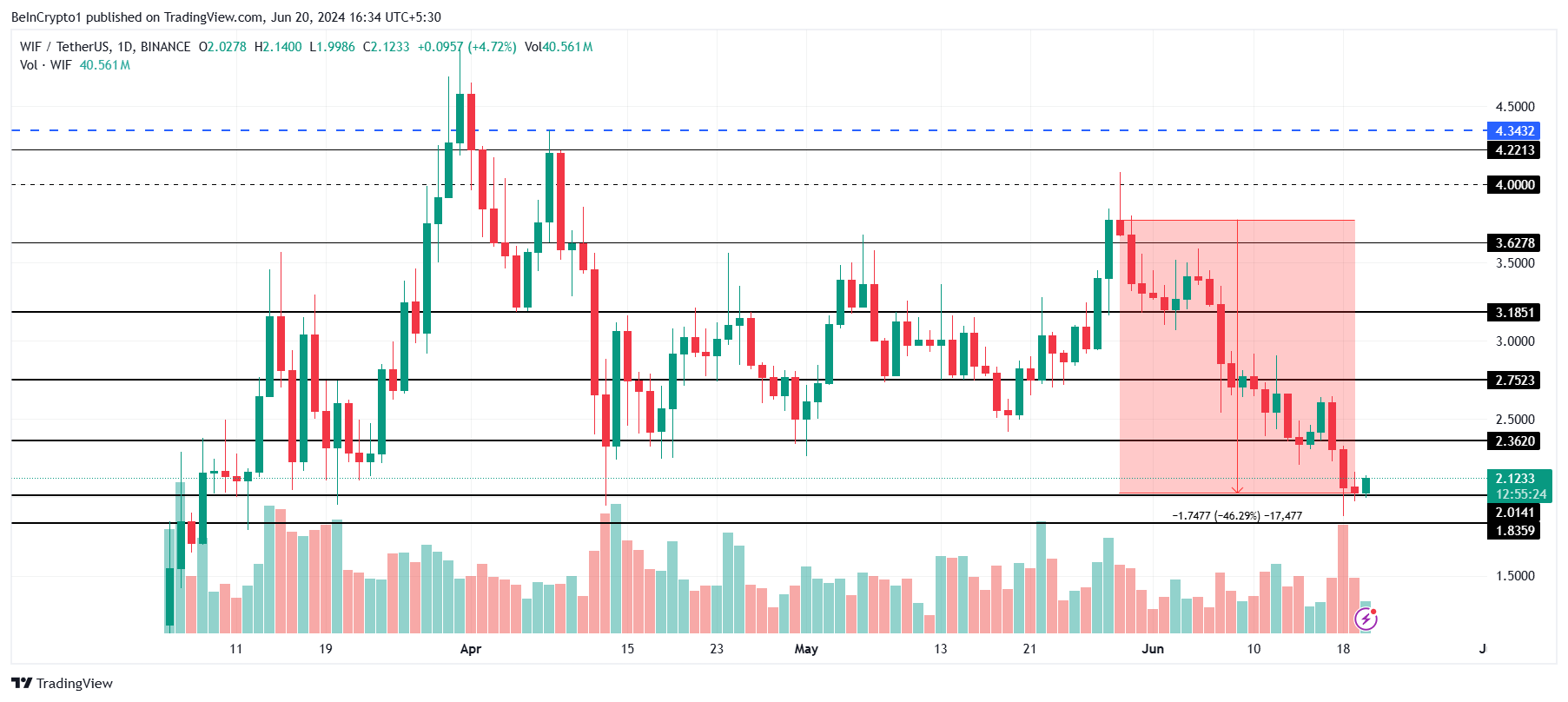 現在、暗号資産は3ヶ月ぶりの安値を記録している。WIF保有者の間で懐疑的な見方が増え続ければ、ミームコインは1.5ドルで取引される可能性がある。