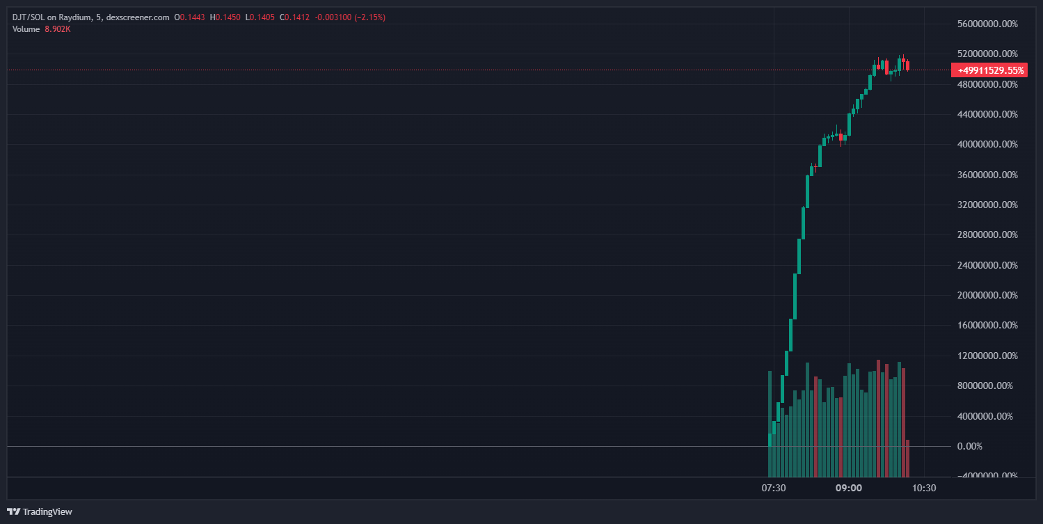 Sponsoredこのニュースはトランプ関連のミームコインに大きな影響を与え、新たに鋳造されたTrumpCoin(DJT)は3時間足らずで約5,000万%急騰し、時価総額を1億4,310万ドルに押し上げた。同様に、別のミームコインであるSatoshi Trump (MBGA)は7,900%以上の劇的な上昇を見せ、時価総額は280万ドルに達した。