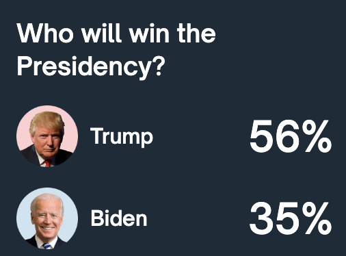 実際、入手可能なデータによると、トランプ氏の暗号資産推進姿勢は、再選の可能性を著しく高めている。暗号資産ベースの人気予測プラットフォームであるPolymarketによると、トランプ氏の当選確率は56%、バイデン氏の当選確率は35%となっている。Polymarketによると、これはトランプ氏の再選の見込みが最高値を更新したことを意味する。