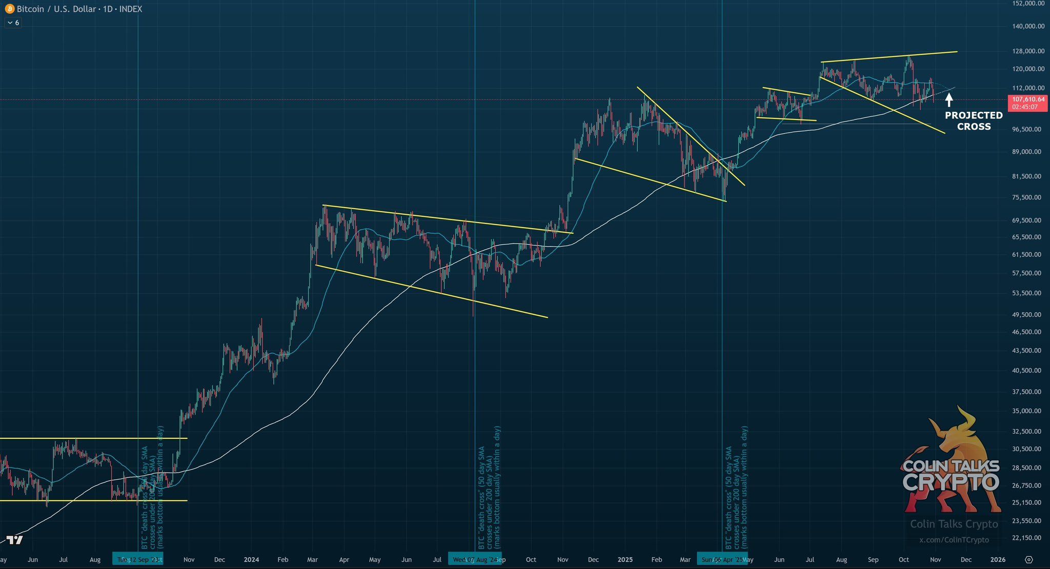 アナリストのコリンによれば、ビットコイン(BTC)の上昇トレンドは、50週間単純移動平均(SMA)を上回っている限り壊れていない。たとえETF流入の鈍化や流動性の限界があるとしても、この重要な閾値はブルとベア市場を分ける。現在、ビットコインはこの重要なレベルの周辺に位置し、50週間SMAは10万2000ドル近辺にあり、これは過去の半減期後のサイクルで強力なサポートを提供してきた。