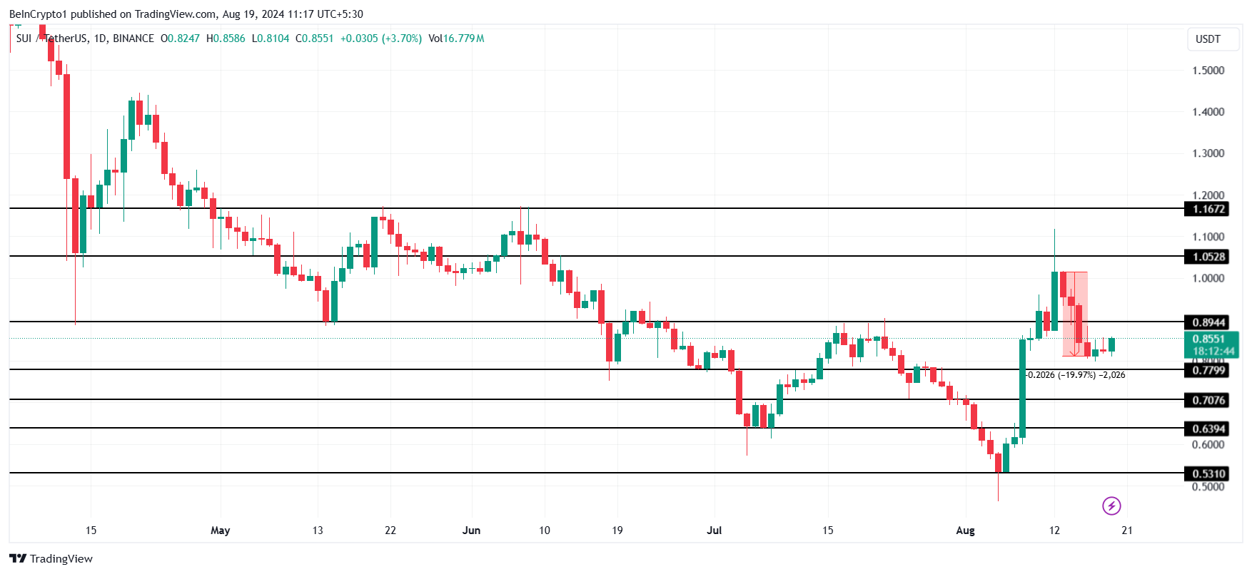 したがって、可能性の高い結果は0.89ドル以下での統合となり、SUIはレジスタンスを突破する努力をする。前述の要因や広範な市場の手掛かりは弱気であるが、アルトコインは0.77ドルのサポートより上で維持される可能性がある。