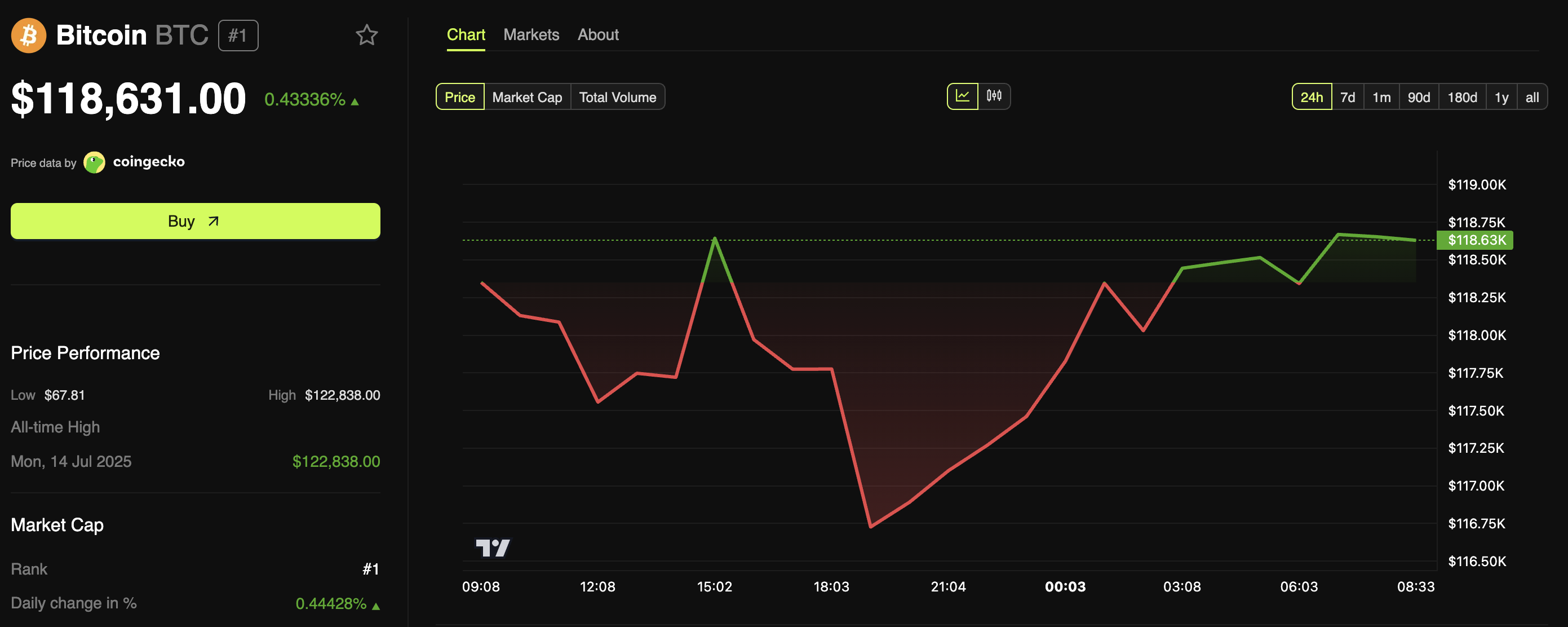この下落は驚くべきことではない。特に、歴史的に、BTCとDXYは逆方向に動いてきたことを考えると。それでも、この下落は短期的なものとなった。ビットコインはその後、短期間で下げ幅を回復しており、足元では11万8631ドル付近で推移している。