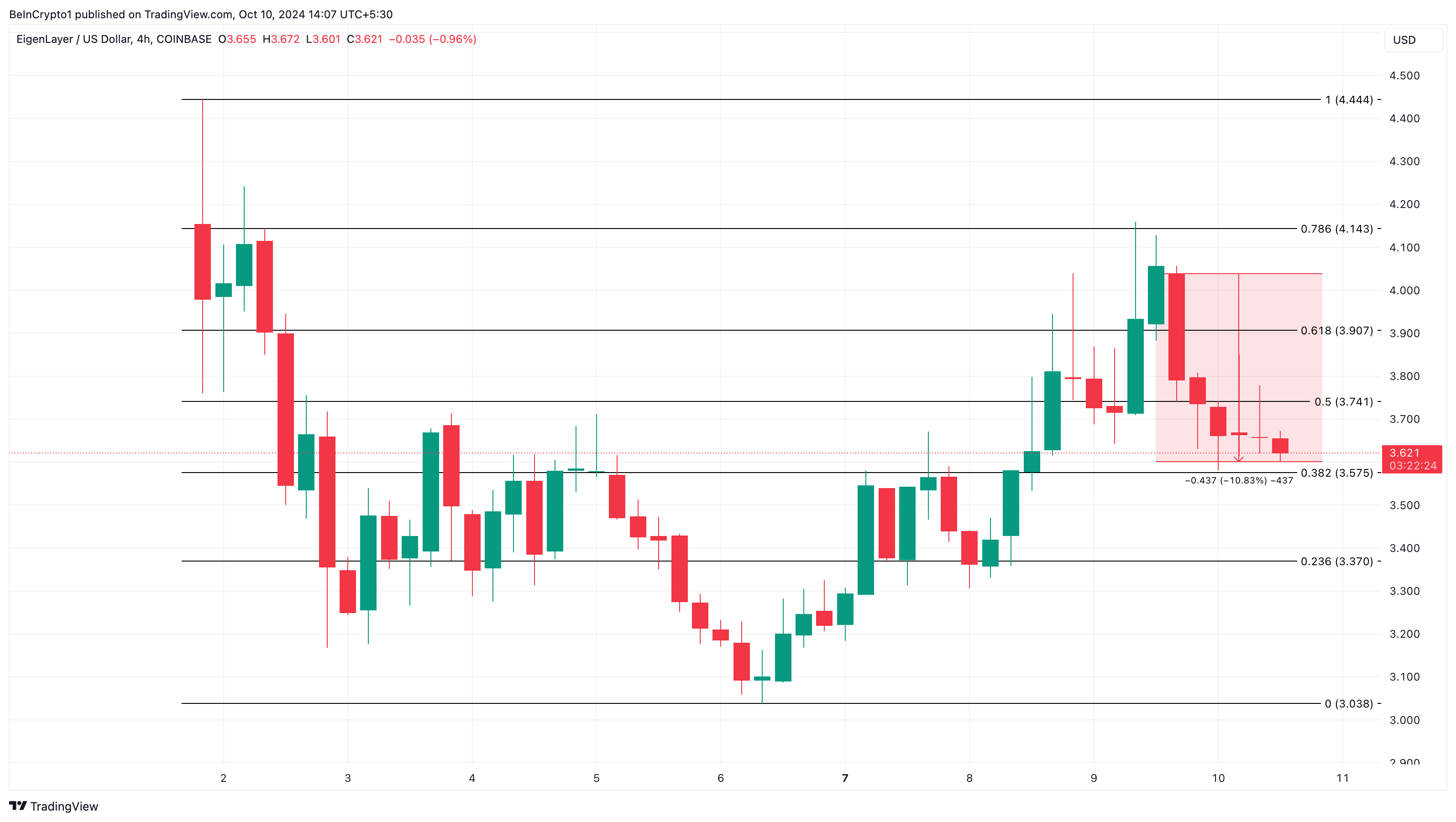EIGENがこのレベルで跳ね返された場合、4.14ドルのフィボナッチリトレースメント78.6%に向けて上昇する可能性がある。