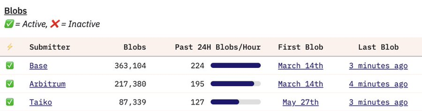 EigenDAの現在の無料ティアは、10分以内に最大768KBのスループットを提供します。これは、現在イーサリアム上で最もアクティブなロールアップには十分すぎるものです。例えば、Coinbaseに裏打ちされた人気のロールアップであるBaseは、10分ごとに2つ以下のブロブしか使用していません。