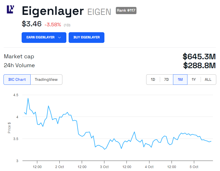 EigenLayerは、総額100億ドル以上のロックされた価値(TVL)を持つ上位3つのDeFiプラットフォームの1つです。10月1日にトークンがリリースされた後、EIGENは一時的に市場資本化でトップ100トークンに入り、完全希薄化評価で70億ドルを超えました。
