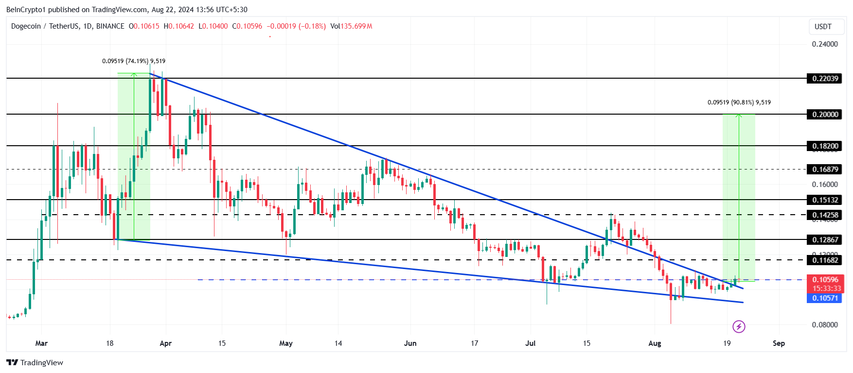 ドージコインの価格は強気の下降ウェッジパターンからのブレイクアウトに近づいており、0.1059ドルで取引されている。このパターンは、ミームコインが90%上昇することを示唆しており、ターゲットは0.20ドルとなる。