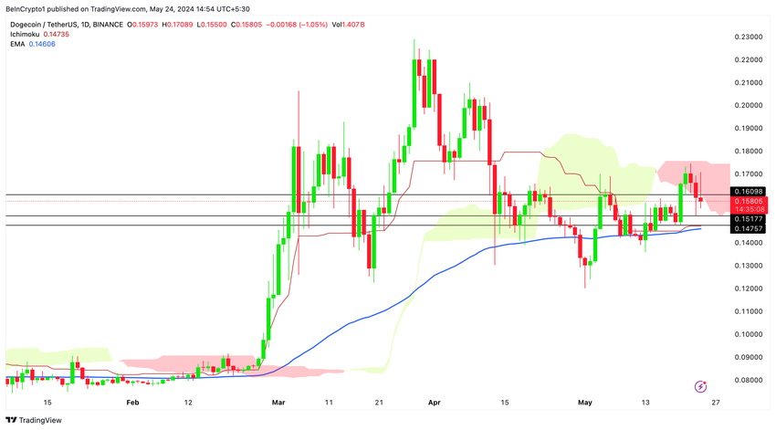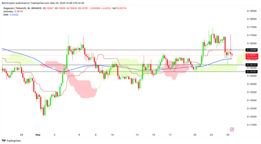 DOGEの価格は現在、4Hタイムフレームで天底と100EMAの間で取引されている。0.16ドルに位置する4H一目均衡表の天底(赤色)にトライした後、DOGEは上昇を維持できず、弱気な展開を示している。