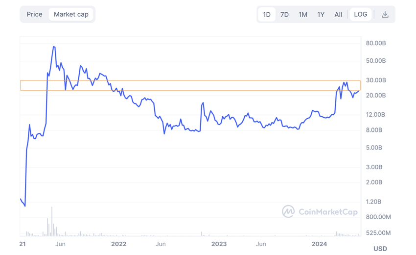 Dogecoin(DOGE)の時価総額は、提供されたチャートに示されているように、重要な範囲(200億ドルから300億ドル)で変動している。この変動の意味を理解することは、将来の市場の動きや弱気な展開の可能性を予測する上で非常に重要です。