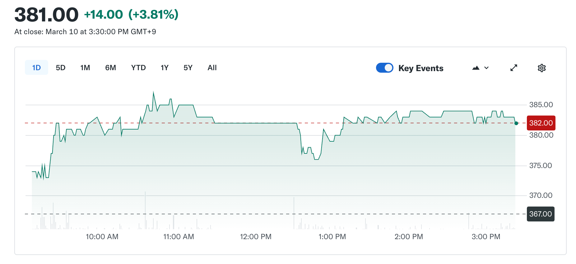 イオレ株(東証グロース:2334)は同IRが開示された3月11日を前後に注目を集めている。直近の値動きとしては、3月3日〜6日にかけて389円から384円へ小反落(週間-1.29%)し、3月4日に-6.17%安、翌5日に+5.75%高と値幅が拡大する場面が見られた。3月10日の終値は381円(+3.81)だった。