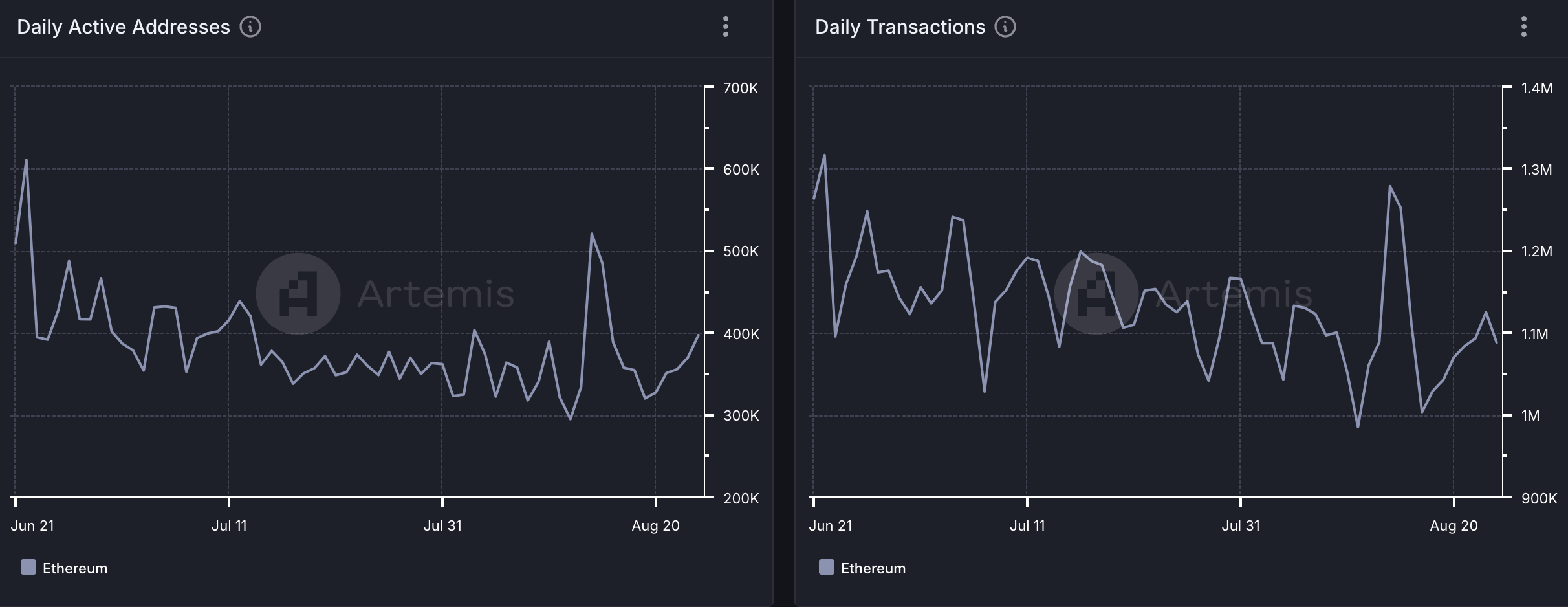 イーサリアムのユーザー・アクティビティはここ数カ月減少傾向にある。Artemisのデータによると、1日のアクティブアドレスが6月22日に611,000でピークを迎えて以来、イーサリアムのユーザー数は37%減少しています。