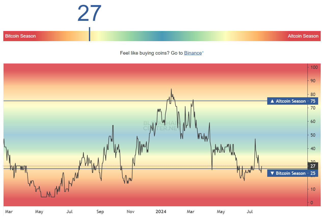 暗号資産市場は投資家の期待に応えられず、その証拠はアルトコイン・シーズン指数に表れている。ビットコインシーズンのしきい値である25付近から抜け出せないままであり、アルトコインがBTCを上回るには大量の資金流入が必要である。