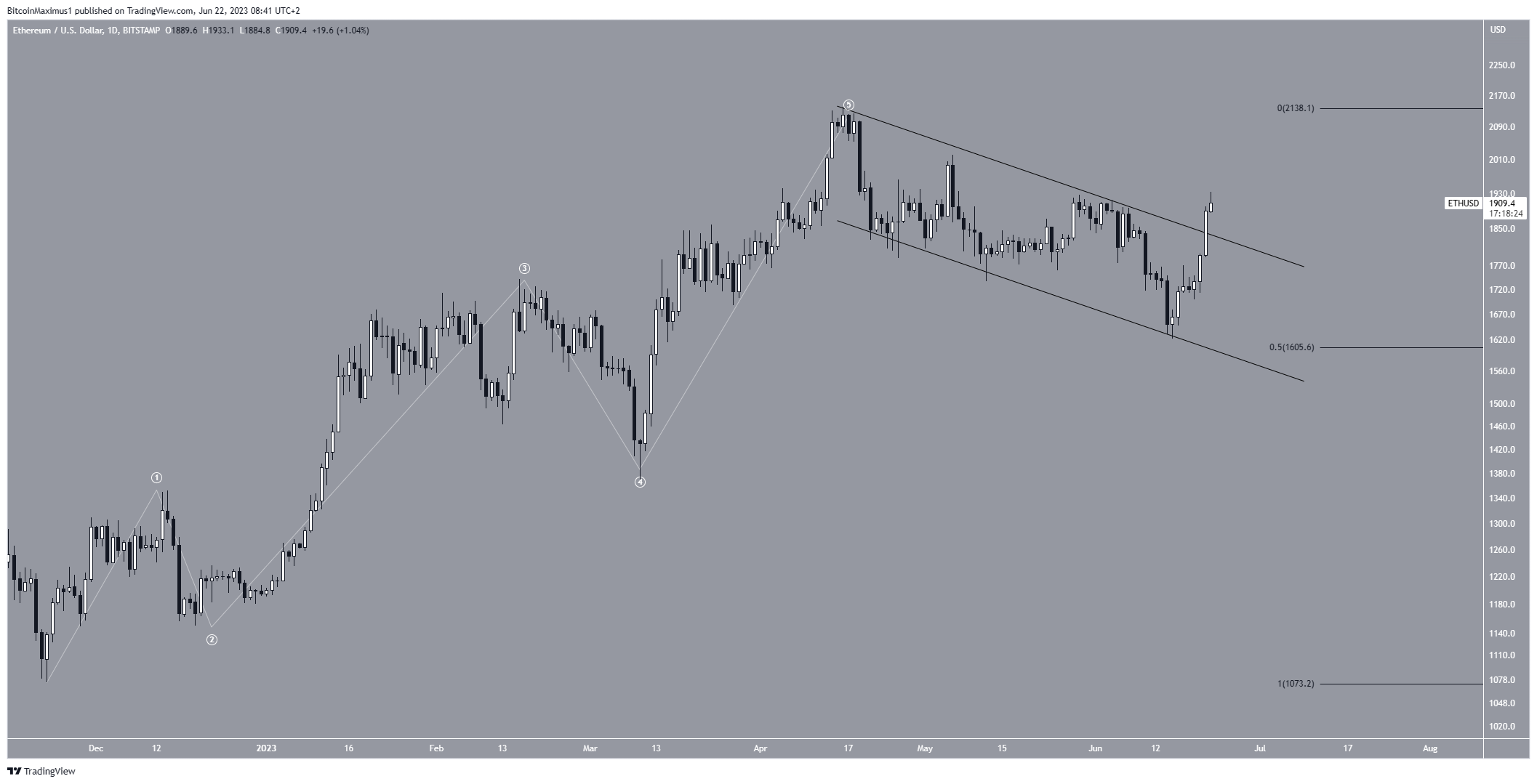 イーサリアムは6月21日、下降チャネルからブレイクアウトした。これは調整期間の終了と上昇トレンドを示唆し、今後、2500ドル付近にある長期の上値抵抗線まで上昇することが予想される。一方、このブレイクアウトがだましに終わった場合、下降チャネル内での修正3波の読みは無効となり、下降トレンドが示唆される。その場合、1200ドルまで下落する可能性が最も高い。