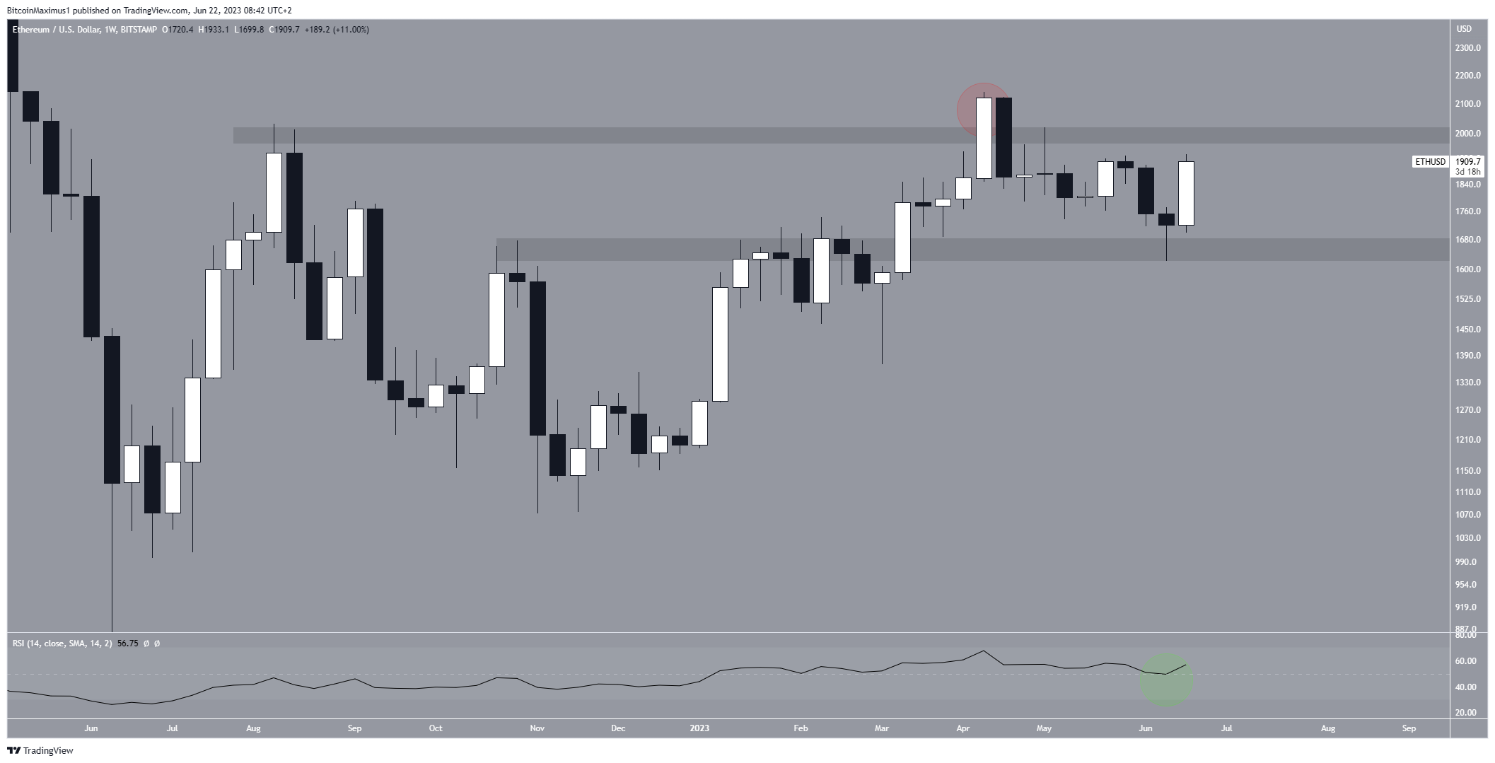 イーサリアムの週足チャートを見ると、4月初旬に1950ドルからブレイクアウトしたように見えたが、だまし(偽物)に終わった。翌週には下落し、その後もしばらく下降トレンドに入った(下記画像の赤丸部分)。6月に入りイーサリアムは先週、1622ドルの安値に達した。この時、1650ドルの下値支持線(サポートライン)が機能し、強く反発した。現在は1650~1950ドルのレンジ相場に入っている。