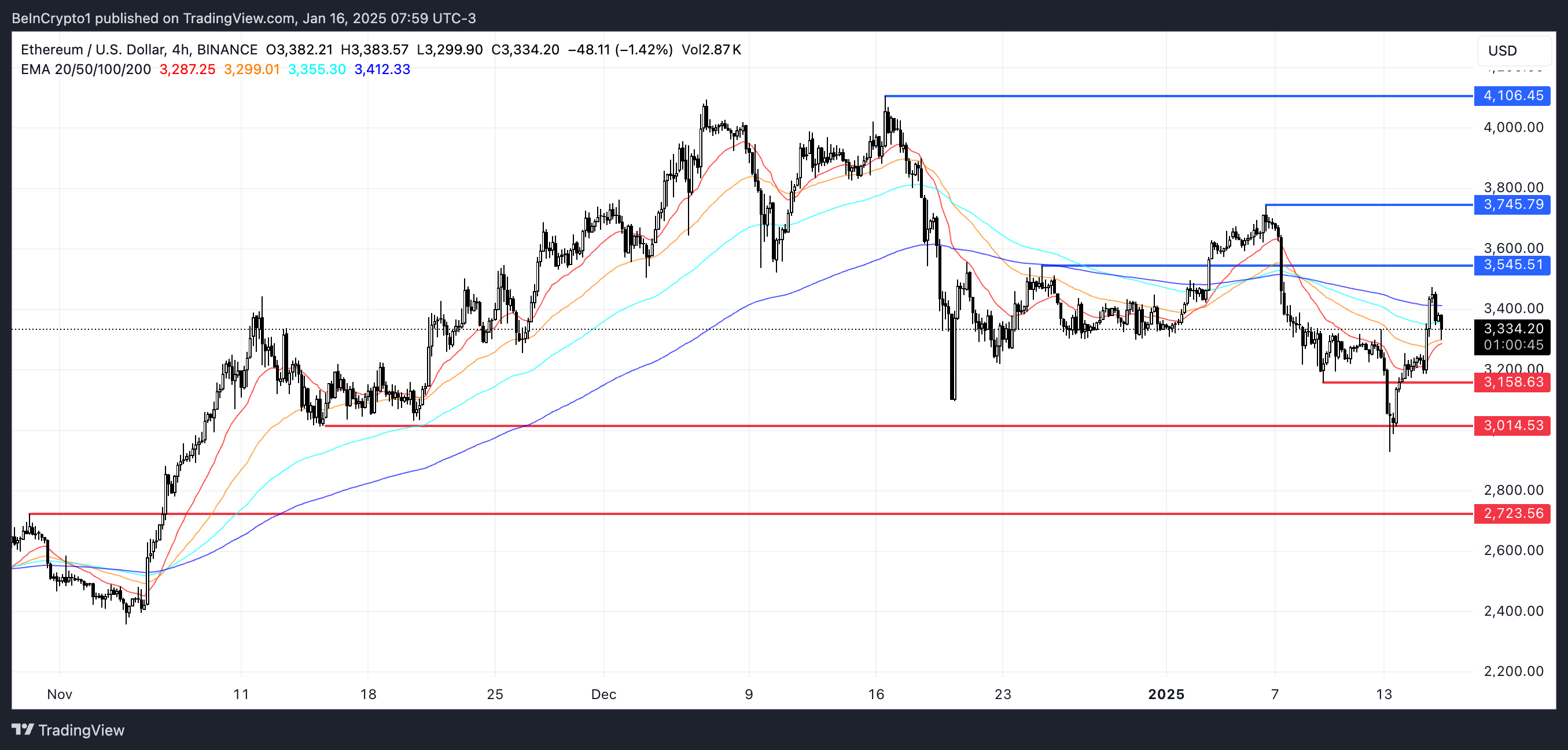 この水準を突破すると、3745ドルへの動きが可能になり、勢いが強ければ、イーサリアム価格は4106ドルを目指す可能性があります。これは、2024年12月中旬以来初めて4000ドルを超える大きな出来事となります。