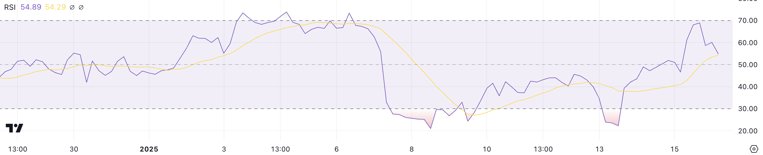ETHの相対力指数(RSI)は現在54.8で、3日前には22.2の低値を記録し、1日前には68.9の高値に達しました。この動きは、ETHが売られ過ぎの状態から買われ過ぎの領域に近づき、安定して中立に近づくまでの急速な勢いの変化を示しています。